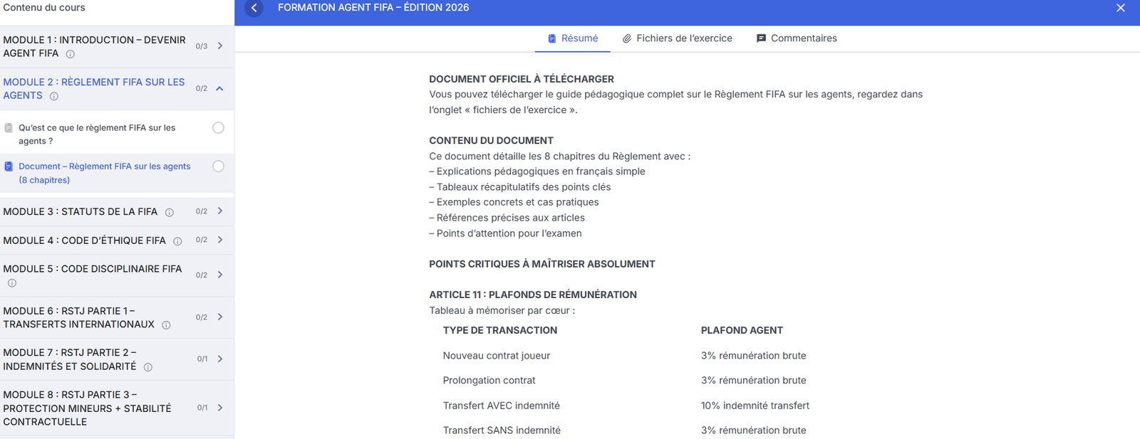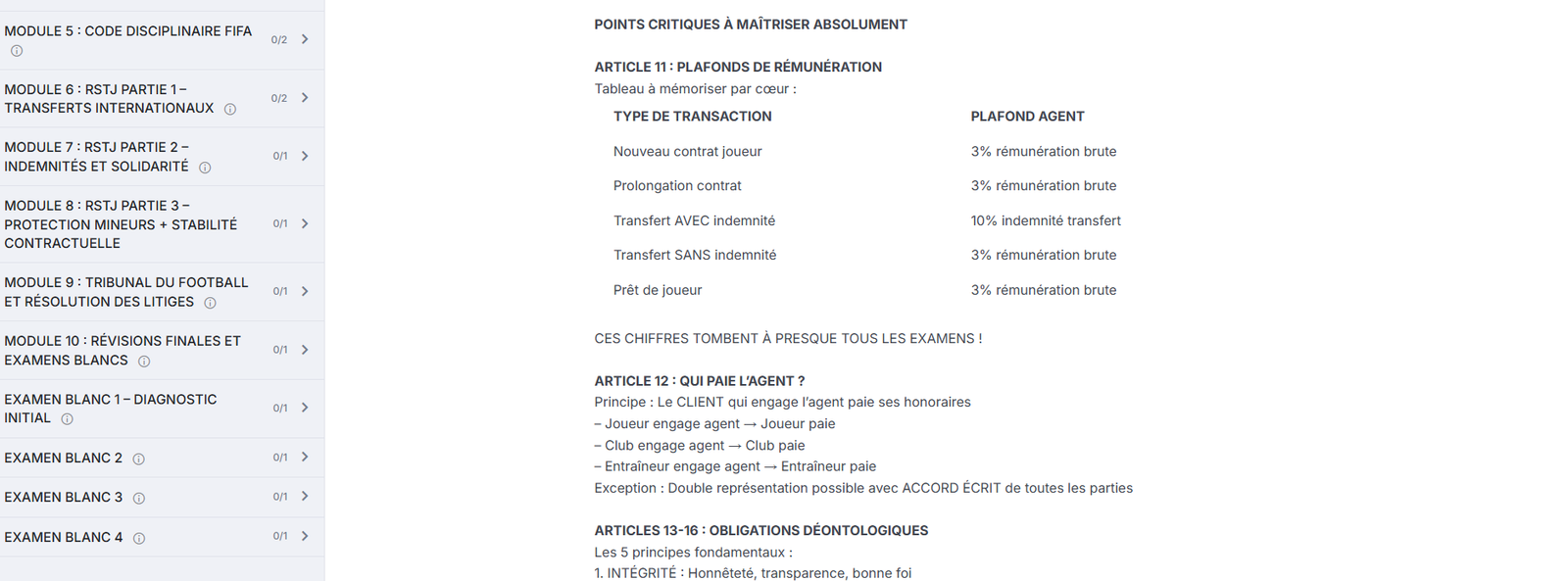 Accédez à une formation complète et structurée pour vous préparer efficacement à la certification d’agent de la FIFA.